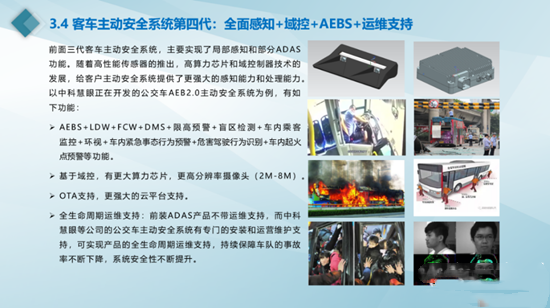 第四代客车主动安全系统包含全面感知+域控+AEBS+运维支持等功能。